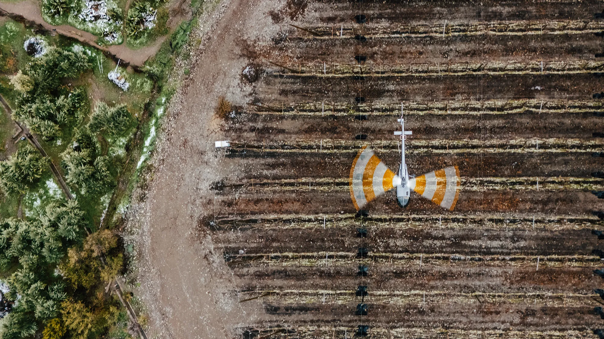 When temperatures drop, sensitive crops such as cherries, grapes, and kiwis are at risk. At Aerotoscana, we use Robinson R66 helicopters to fight frost in real time, increasing air temperature over the fields and preventing damage to blossoms and fruit.